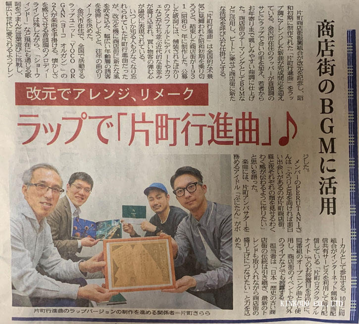 片町商店街には昔「片町行進曲」という曲がありまして、それを令和風にアレンジをして新しい片町行進曲を作ろうという試みを。ボーカルには「ぷにたん」という女性アイドルも起用してもらい。新聞右側の「YOKO ORGAN」さんに新たに曲を作って頂きました。