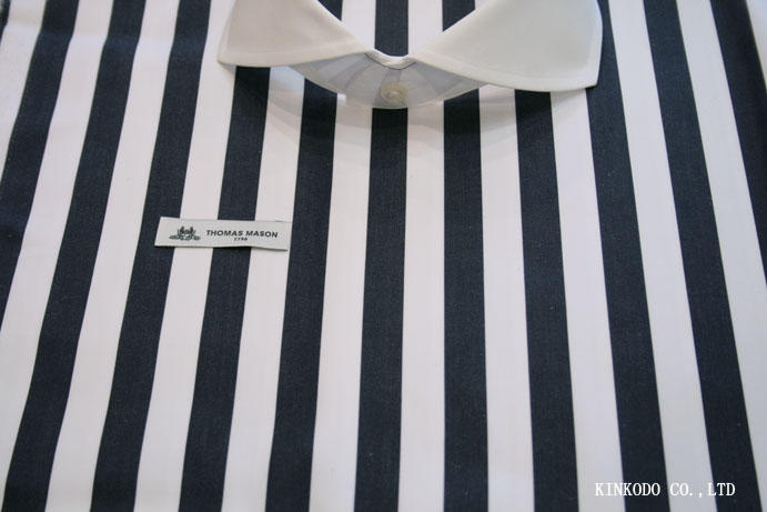 大きなシルエットだから大きな巾のストライプもいきてきます。超太巾のネイビーのロンドンストライプ ThomasMason トーマスメイソン社 イタリー製生地 綿100% お仕立て上がり¥18,000+税。