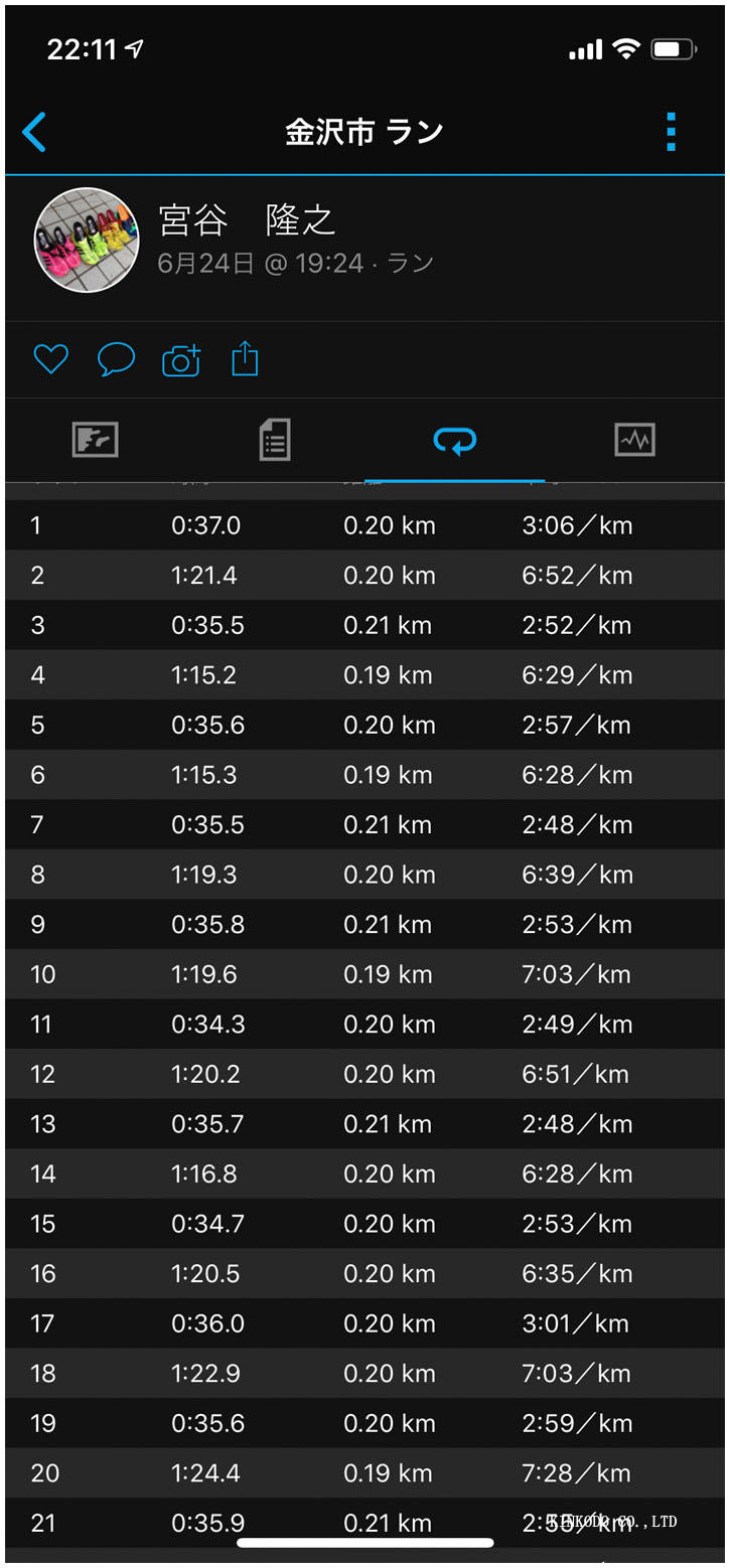 変更したメニューは200メートル×10本 設定ペースは40秒。1キロ3分20秒ペース。