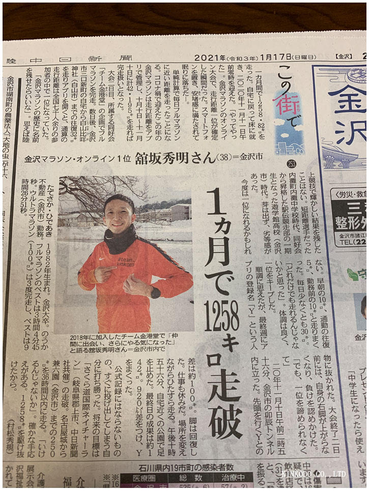 金沢マラソンのオンラインマラソンで約一月の間に1258キロ走ったチームメイトのことが載っていました。