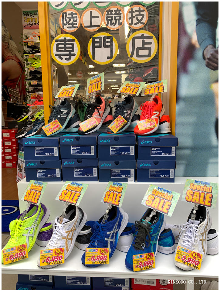 セールやってました。アシックスのターサーも格安。昔だったら買ってましたが、今薄底ほとんど履かなくなってますしね。練習で使うのであれば、まだターサー2足あるし。