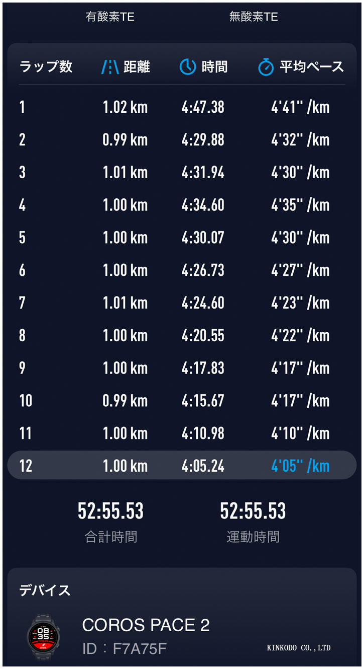 最初の入り間違えました。2キロ目急に早くなってあとはバラバラ。半分過ぎてからまあまあまともに走れましたが。