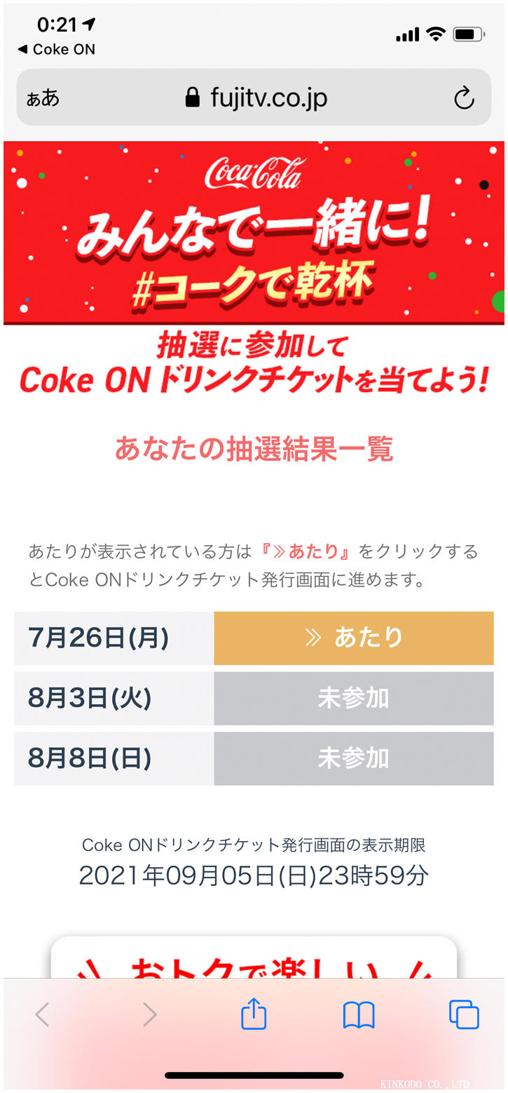 昨晩オリンピックを見ててコーラのCM中にQRコードが出てきたので、読み取ったら当たりました。