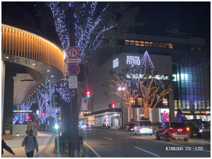 店から見てふと左を見ると。香林坊にはすでにイルミネーションが。ちょっとコロナのおかげで暗い時期が続いていましたので、早く点灯されるのは気分も盛り上がってきていいですわ。