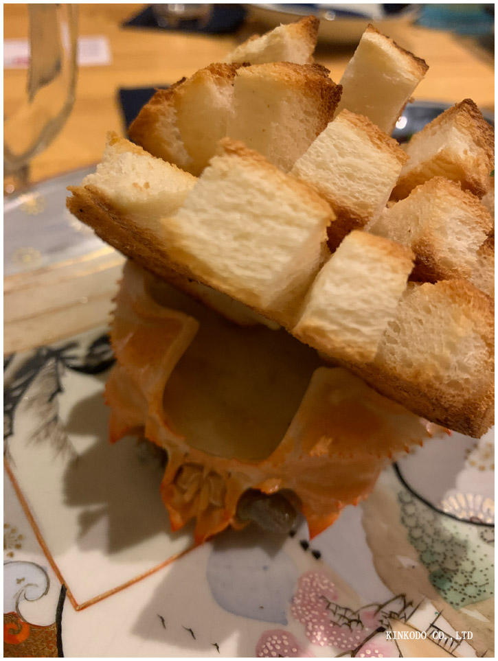 カニクリーム。上に乗っているのはパン。パンで甲羅の中のカニクリームをすくって食べるという料理。