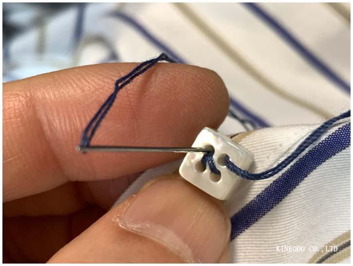 ストライプの色に合わせてボタン付け糸をチョイス。ブルーやネイビー系での濃淡が色々あるのです。