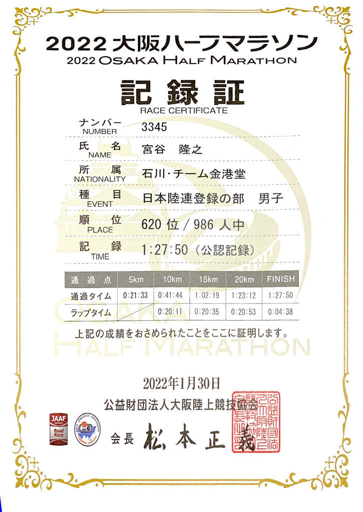 鈍色ショコラヴィレTVerで配信。大阪ハーフマラソンの記録が届いた。