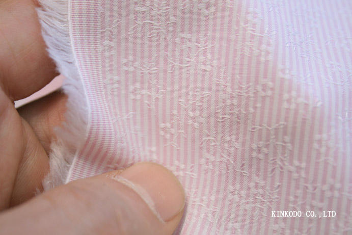 この生地はストライプの上にジャガード織りにて花柄を描いています。ベースも優しい春色のピンク、そして柄も花柄ということで、これからの季節にピッタリです。早く平和な時代が来て誰もが花を愛でられるようになればいいと願っています。
