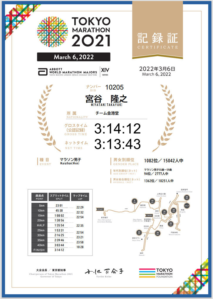 正式な記録はグロスタイム3:14:12 ネットタイム3:13:43でした。 男女別順位は1082位/ 15042人中 マラソン男子55歳~59歳では、94位/ 2777人中。 男女総合順位は1362位/ 18251人中でした。