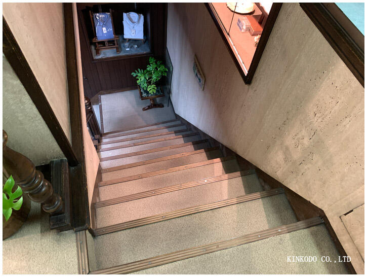 狭くて急。お客様には気をつけて頂けるようにお話をしますが、地下で採寸をしご注文を聞きながら、ご注文の間にも一階と二階を往復することも何度か。その為にマラソンで足を鍛えていると言っても過言ではありません。いや結果的に仕事に役立っているのですが。