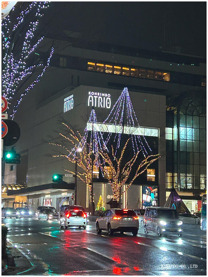 金港堂の前からアトリオのイルミネーションを撮りました。前の二台は信号待ちで、向こう側は車が流れています。