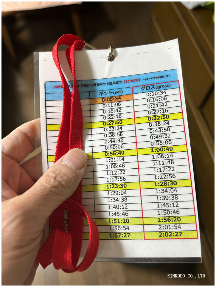 当日のペース表。ネットとグロスの差が5分。5分34秒ペースで走れば4時間以内でゴールができる設定。一応これを基準に走ることになりました。ハーフ以降のラップは裏面に記載されています。割りと使い良かったです。
