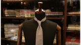 このようなチェックのシャツをタイドアップして着るのはなかなか難しいのですが、このような立体感のあるソリッドタイ(厳密にはソリッドタイではありませんが)を使うとVゾーンもしまってオシャレ度アップすると思います。パンツはダーク色でまとめてもいいし、明るめのパンツだったら、靴を茶色にしてしまえば問題ありません。