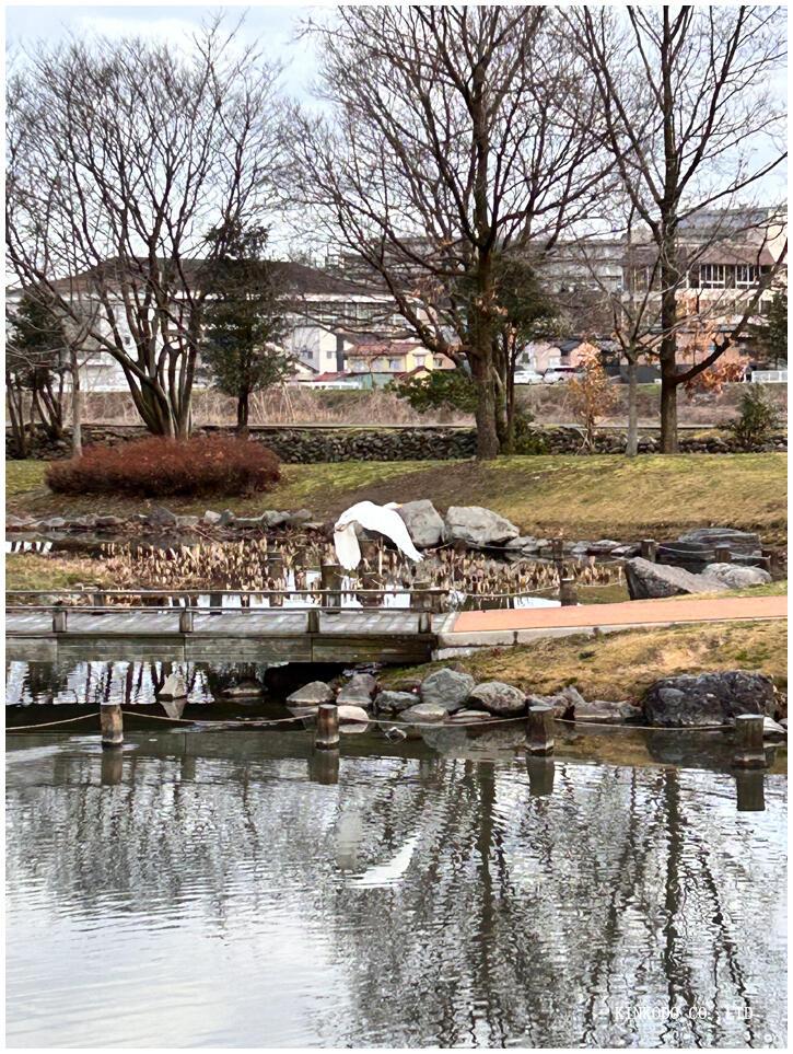 公園の池の前に大砲みたい、しかも迷彩柄にペイントしたカメラを持った人が一人。何を撮っているかと思ったらサギでした。私もスマホを車から持ってきてちょうど飛び立つ時に一枚。