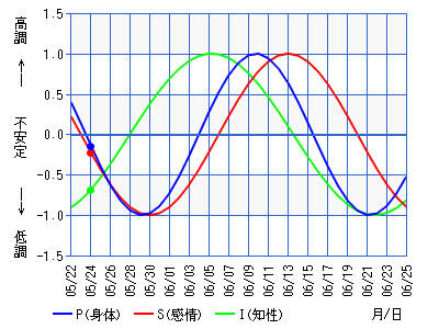 生年月日を入れるとこの表が出てきたのですが。今日が5月24日。ちょうど下がり基調に入ったところ。というかこれでまだ底じゃないのか?レース本番の26日も身体は下がり基調。知性なんて上がったって仕方がないと思うのですが。