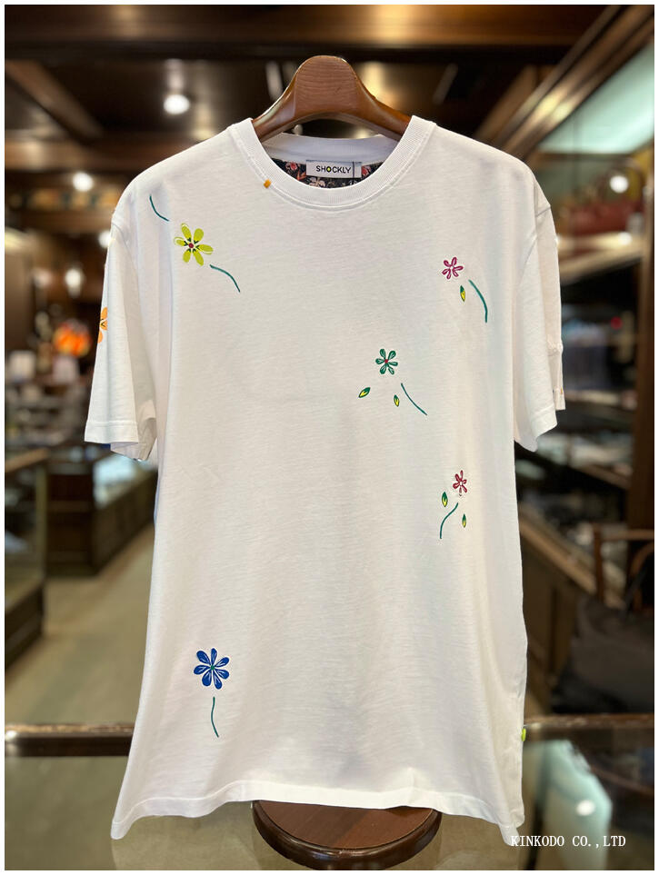 こちらのTシャツは新入荷、新ブランドのTシャツ。イタリアのSHOCKLYというブランドで、フラワープリントが施されています。衿の後の所にもプリント生地が配置されていて、着用する時も楽しんで頂けることと思います。背面にもわずかですが、フラワープリントがございます。