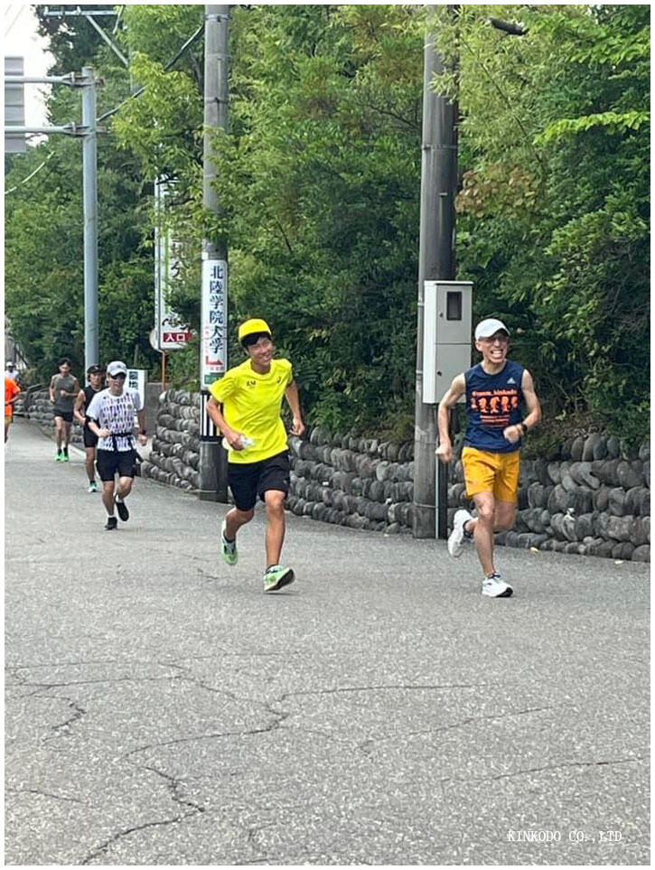 坂を上りきって、大乗寺丘陵公園から下界を見渡すチームメンバー。今日は気温は高くなかったものの、湿度が高く、汗だくでした。台風が近づいている影響ではないかと思います。