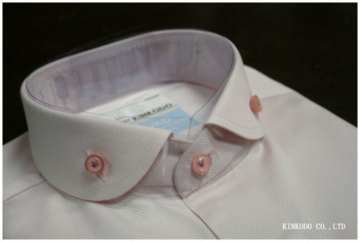 当店では「スタンドのボタンダウン」と呼んでいますが、通常の衿羽根の長さを短くし、衿羽根の先を丸くしたボタンダウンです。さらに、衿台にボタンを付けています。