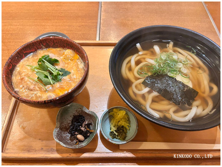 お昼前に行ったのでスムーズに入れました。選んだのは「あんかけ親子丼とうどんのセット」タッチパネル式で選びますが、うどんの玉もひと玉、ひと玉半、ふた玉と選べました。私はひと玉半。取引先も同じものを注文しました。
