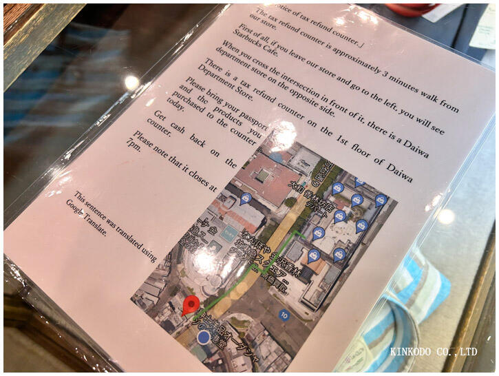 当店独自ではタックスフリーの手続きはやっていないのですが、まさに歩いて2分の大和デパートさんでその手続を代行して頂いてますので、本当に助かってます。書類にレシート貼って、そして商品とパスポートを持って行ってと言えば分かってくれますし。もちろん英語で話しはしますが、これをお見せします。