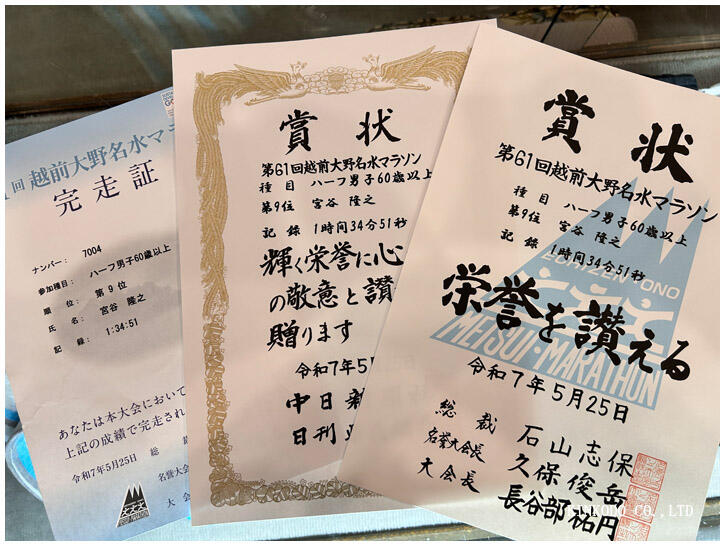 1時間34分51秒。爺さんハーフの部9位。パンフレット上には60代男性は232人エントリーなので、爺さんの部ではまあまあ優秀な方かもしれませんが。