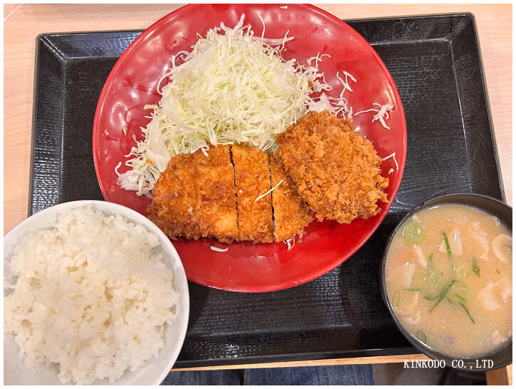 とんかつとメンチカツの定食。味噌汁は豚汁。何でも1000円以上もする世の中で、これでクーポン10%OFF(アプリより)使ったら900円しないって凄くないですか?