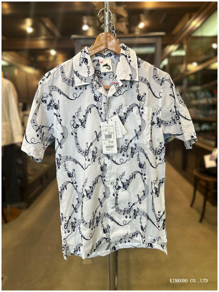 昨日入荷しました。音楽柄のシャツです。音符の上に楽器を演奏している人が乗っていますが、これ全部刺繍なんです。刺繍の生地は生地自体が高価。高価だから良いシャツというわけではなく。