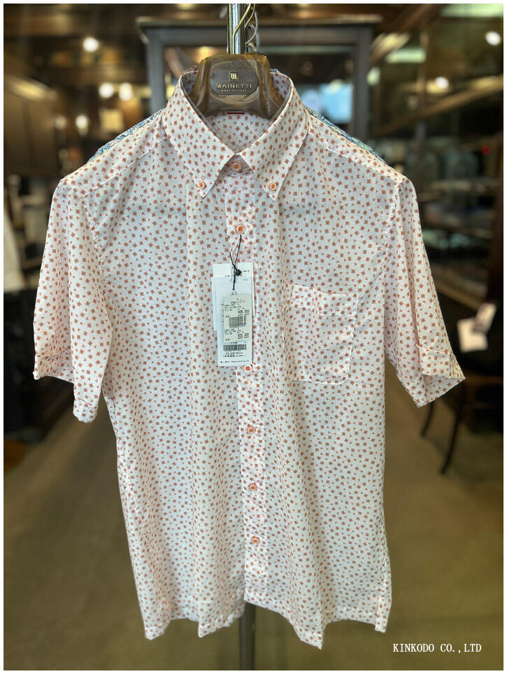 イタリア製生地を使った、ピンクの可愛い小紋柄のボタンダウン半袖シャツが、25,300円の30%OFFで17,710円。片町プレミアム商品券を使えば、15000円購入で、3,000円のプレミアムがつくので、18,000円。290円残りますが、それはスギ薬局さんで帰りにのど飴でも買って行って頂ければと思います。別にスギ薬局さんじゃなくてもいいですが。つまり25,300円のシャツが15,000円で購入できるということですから、約40%OFFでになります。
