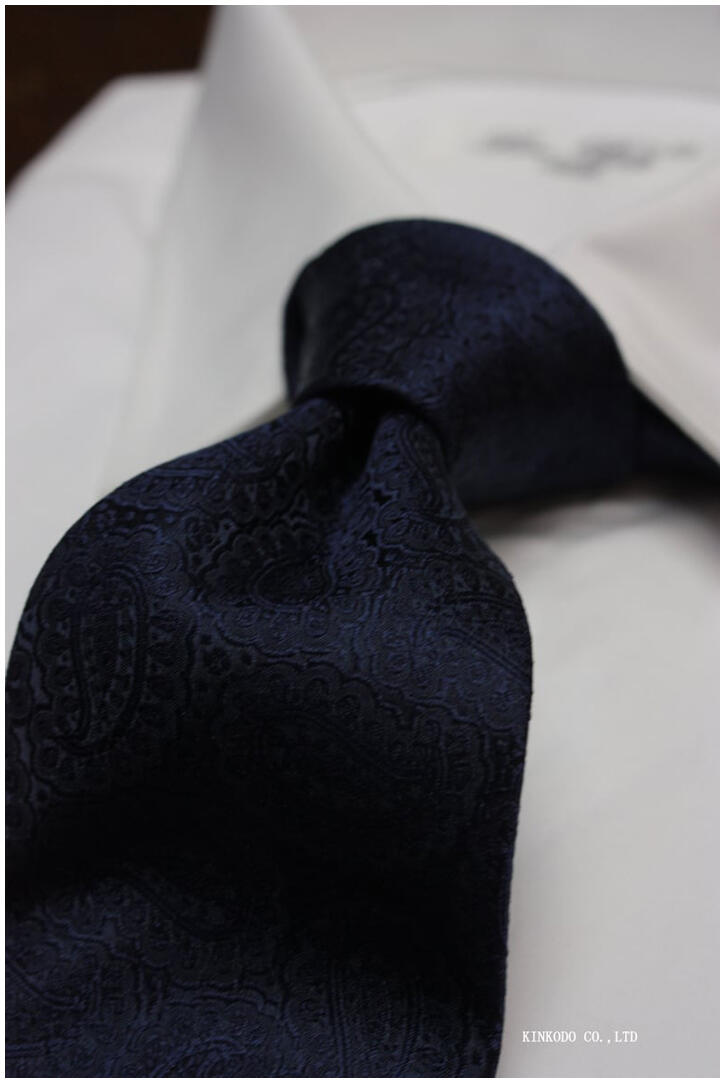 一枚目の写真でお分かりのように、ノットを作ると立体感と陰影があらわれ、ドレスからビジネスまで上質な存在感を演出。場面を選ばず締めるほどに良さが伝わる、長く使えるネイビータイだと思います。