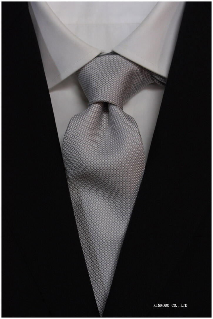 モーニングなどを着た場合は昔は黒白のストライプのネクタイだったのが、最近はシルバーのサテンのネクタイをしめる機会も多いようですが、このようなマイクロドビーの立体感と光沢のあるネクタイも良いかと思います。