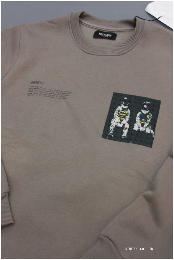 An Italy-born crewneck sweatshirt from Ko Samui Tailors. A block of English text introducing “BANKSY” sits on the left chest, paired with an art patch on the right that evokes street art. The patch is layered with rounded, block-like embossing, giving it a tactile, three-dimensional finish. Made from soft brushed cotton fleece, it has a classic fit that works well on its own or as a layering piece.