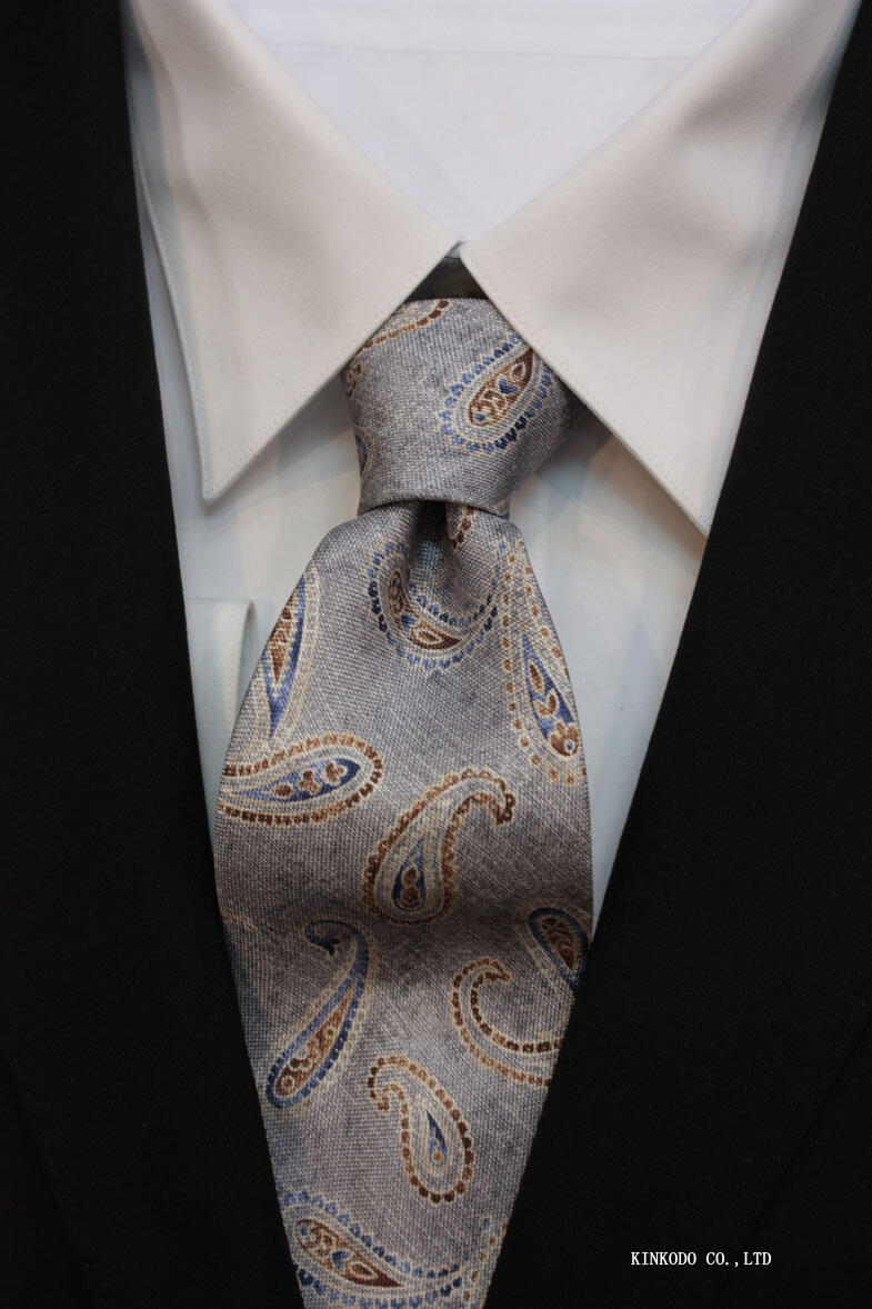 グレーベースに、ブルーとブラウンを効かせたペイズリー(更紗)柄のプリントタイ。