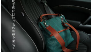 殺風景な助手席にはいつもの相棒が。普段から、そしてちょっとした出張や1泊くらいの旅行でもいつも助手席に座っている。